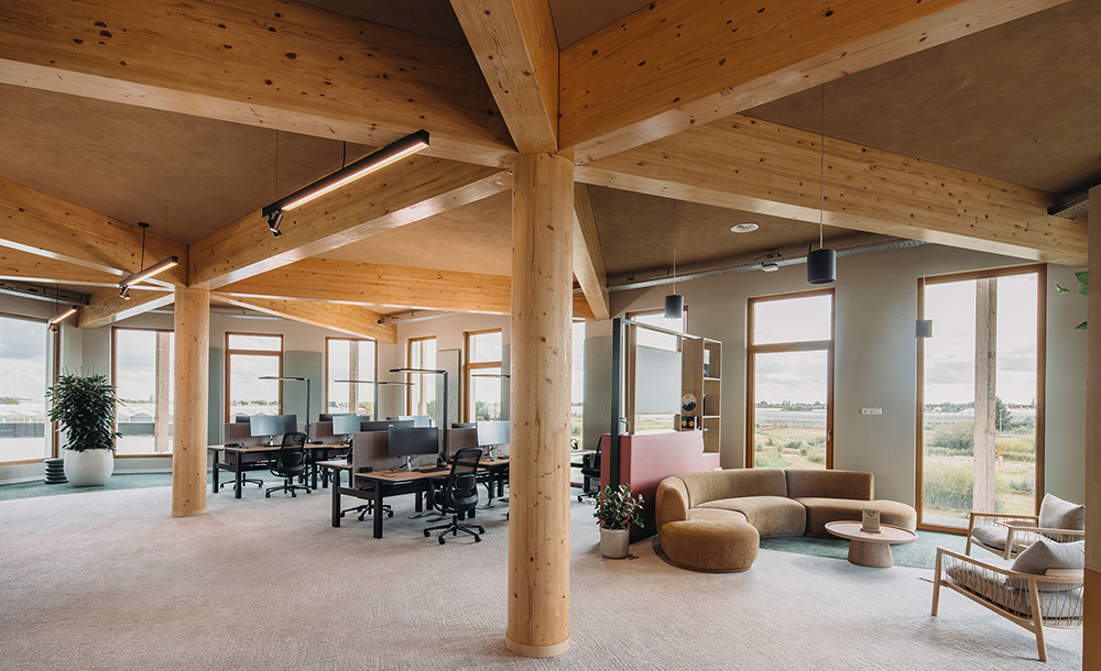 Niederländischer Outdoor-Spezialist setzt am Hauptsitz auf 1.270 Quadratmeter Natur-Klimadecke von Argillatherm / Holzrippen-Konstruktion in Wabenform