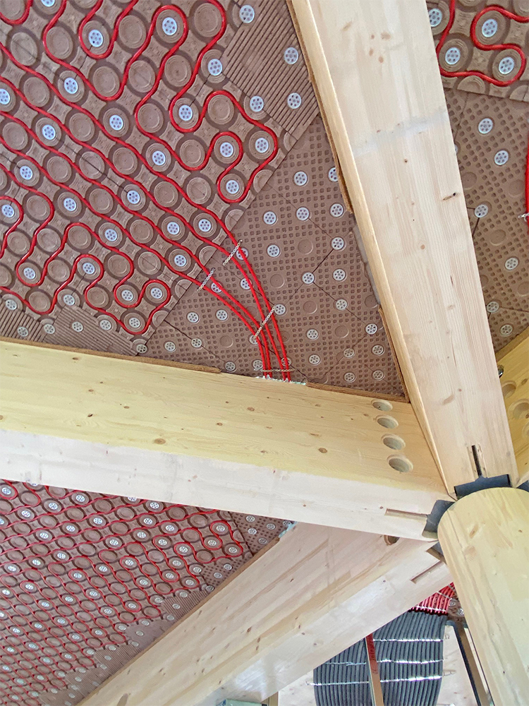 „Im Fall von Bever stellte uns die Deckenarchitektur allerdings vor besondere Aufgaben“, sagt Axel Lange, Geschäftsführer von Argillatherm. Denn für die Holzrippen-Konstruktion in Wabenform war mit den herkömmlichen quadratischen Modulen nichts anzufangen. „Wir haben deswegen alle Felder einzeln mit CAD geplant, um den Holzbau mit den nötigen Infos zu Aussparungen in den Balken zu versorgen.“ Tatsächlich gelang es so, alle Felder mit Humid-Modulen auszustatten sowie alle Rohrleitungen für die Heiz-Kühl-Funktion kupplungsfrei zu verlegen und an den Heizkreislauf anzuschließen.